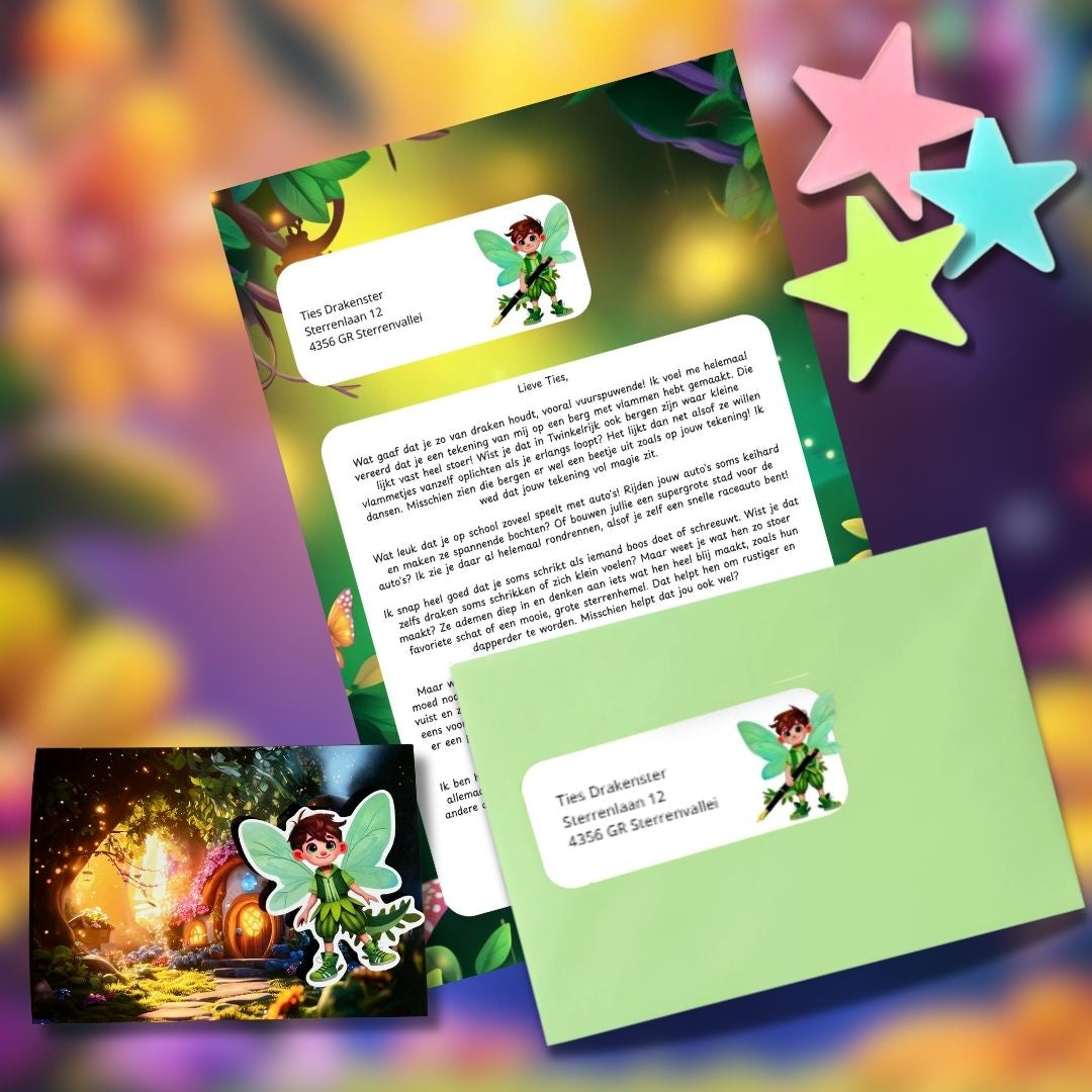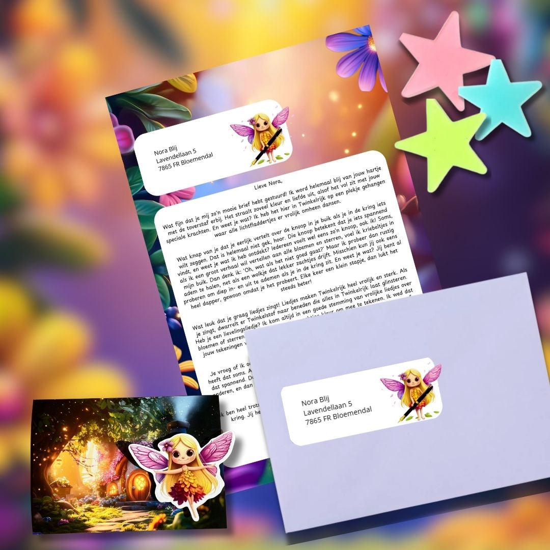 De eerste brief is extra speciaal. Die bevat een geïllustreerde kaart van het huisje van het penvriendje én een kaartje van het vriendje zelf, met magneetjes, zodat het penvriendje echt zijn plekje krijgt. Bij elk brief zit daarnaast een glow in the dark ster. Zo groeit er thuis, stukje bij beetje, een eigen Twinkelrijk op de muur of het plafond.