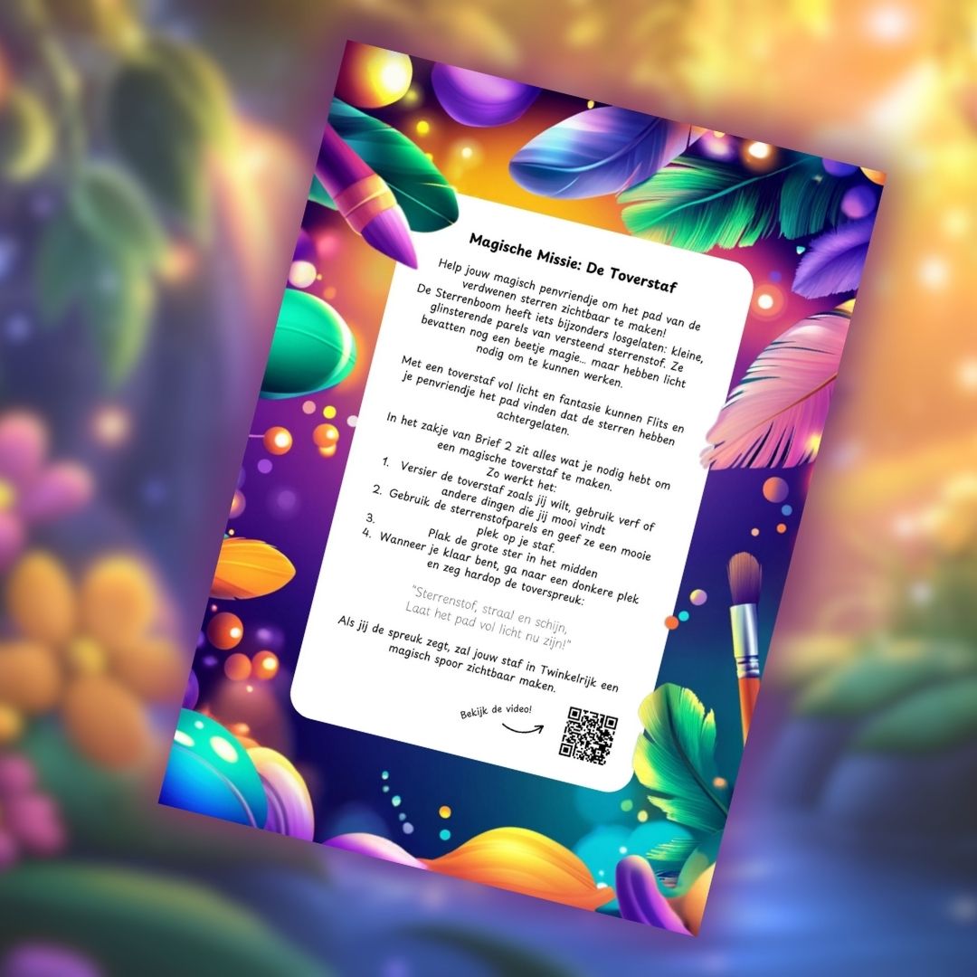 🌟 De magie groeit met elke brief. En het mooiste? Jouw kind staat telkens zélf centraal in het verhaal. Elke brief bevat een unieke knutselmissie met alle materialen die nodig zijn om de magie écht tot leven te brengen van een twinkelend raam tot een glow-in-the-dark toverstaf. Jouw kind helpt het vriendje en Flits, haar dappere Lichtfladdertje, steeds een stapje verder in hun zoektocht.